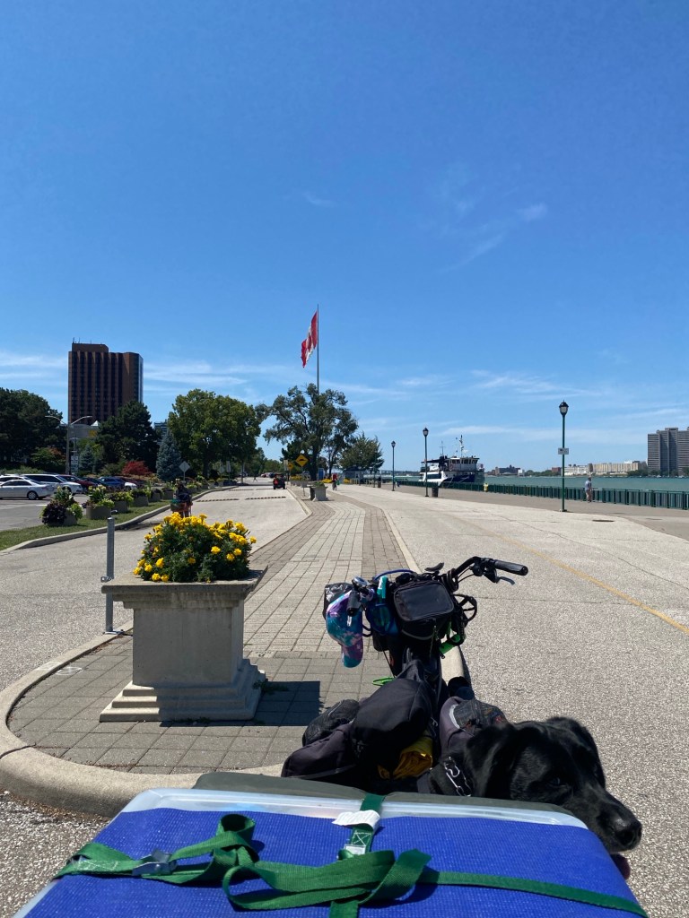 As you remember from my last blog, it was a challenge getting to Windsor from Belle River. The weather had Dax and I socked in until nearly 6pm. We finally felt that it was safe enough that we could chance it and ride the next 18 kms into Windsor where Benny, our Warmshowers host and his family were waiting for us with a warm welcome, a hot meal and a safe place to pitch the tent. He did apologize the next morning for not giving me heads up about his neighbour who sits up all night on his back porch coughing.. I didn’t hear the neighbour until 1 am. Scared the bejeeses out of me. I unzipped my tent to look if someone had snuck into the backyard, but there wasn’t anyone insight. I called out,”who’s there!”- but no answer. It took a few more coughs before I cottoned on that it was the neighbour in his yard. I fell asleep and was pretty rested the next day considering how stressful the last 24 hours had been. We laughed about it all the next morning. My mood had also brightened with the morning sun and a promise of great weather to come for the next week. Benny sent us off with a great breakfast, lots of fresh water and all our electronics fully charged and with an invite to return. We look forward to visiting Benny and his family again.