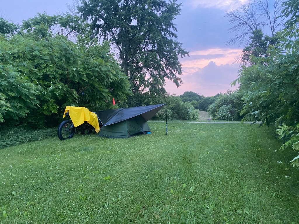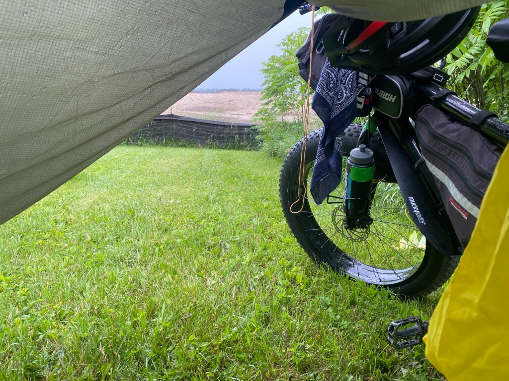 The next morning I woke up to see that there was a weather warning for moderate rain for an hour between 5 am and 6 am. Since it was 4am, I took the opportunity to set up the rain tarp and cover the bike with my rain cape.