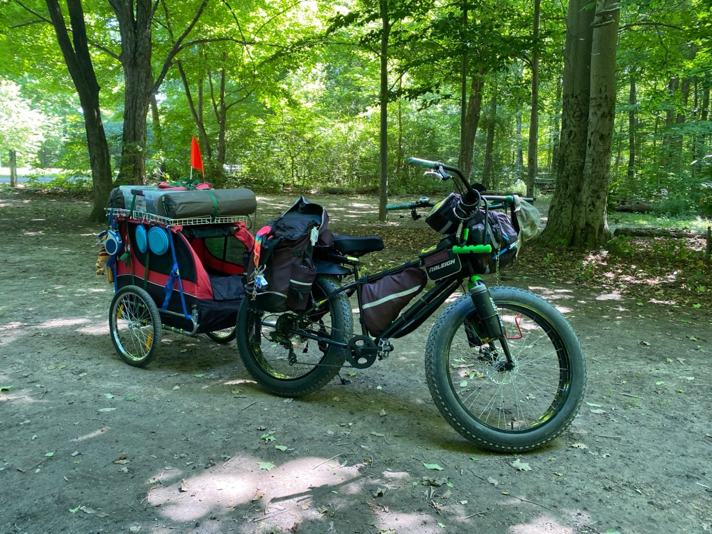Later in that night Dax and I got woken up several times by raccoons trying to get into the dog trailer. That was where my panniers were stored and I forgot to take our food out of them. Fortunately they couldn’t get into the trailer but Dax and I were so worked up about the raccoons bothering us that not only did we not sleep but Dax tore two holes in my sleeping mat with his nails. I had to use my down sleeping bag as a buffer between me and the cold ground. I was so tired and annoyed the next morning, I decided to stay an extra night to rest more. My plan for the next night would be to take all the food and put it in the panniers and then the washrooms for overnight. Hoping that the raccoons would leave us alone and we’d be able to sleep. Unbenounced to me and Dax, it didn’t quit go that way. That next night, the raccoons had different plans for us.