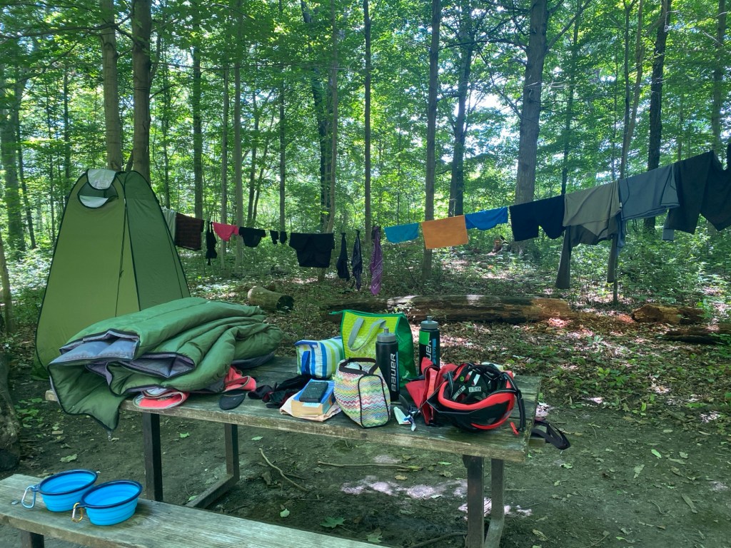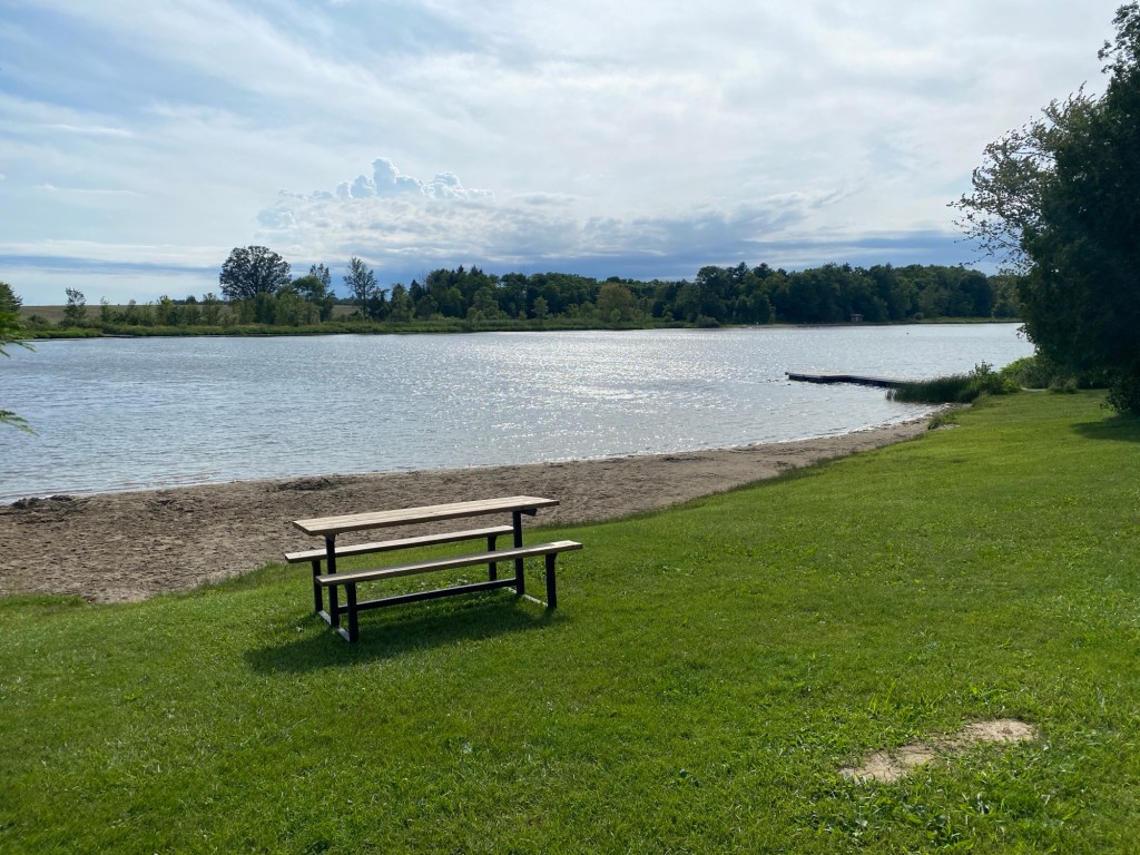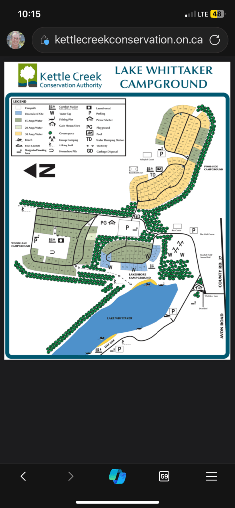 So, in the morning I patched my sleeping mat using my bike patches. They worked well. After lunch, Dax and I settled down in the tent for some reading and a nap. We woke up around 1pm to some terrific wind. Rain was coming and the conservation employees came around to check in on us because of it. They said that there was a storm warning with severe winds and they wanted to know if I was going to be okay tucked into my little tent. While she was telling me this, a tree fell right behind my tent. Well, it didn’t take any more convincing for me to jump out of my tent and into her truck. I said, I’m going with you!!!!! We squeezed Dax in the front-seat and off we went to the office to take shelter. The power had gone out as well, so there was no communications for the employees or the campers – no phones or wifi. We waited in the office for almost 2 hours before it felt safe to return to our tent. Fortunately, my campsite was unharmed and all my equipment survived including my pop-up tent. I was impressed that the 4 little stakes held it in place through those severe winds – good to know. It took till well after 7:30 pm for the power to come back on. I was grateful that I had all my electronics fully charged from the day before. So Dax and I had some supper, put all the food in the panniers with a note on them that said,” don’t tell the raccoons the food is in here!!!!….ha!!!” This was just incase another camper or employee came into the washrooms and thought the panniers were left behind by someone. I hoped that anyone reading the note would clue into what I was doing and not take our panniers to the lost and found. This part of our plan worked perfectly.